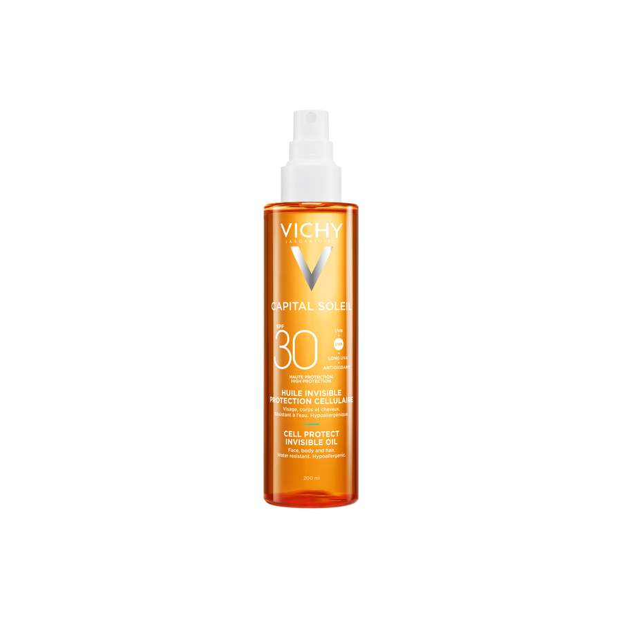 Huile solaire invisible offrant une protection SPF 30 contre les rayons UVA, UVB et UVA longs. Elle aide à protéger la peau au niveau cellulaire tout en améliorant sa qualité et en prévenant le vieillissement cutané. Sa formule enrichie en squalane et en vitamine E hydrate et nourrit la peau. Sa texture légère, non grasse et au toucher sec laisse un fini invisible et lumineux, adaptée au visage, au corps et même aux cheveux.