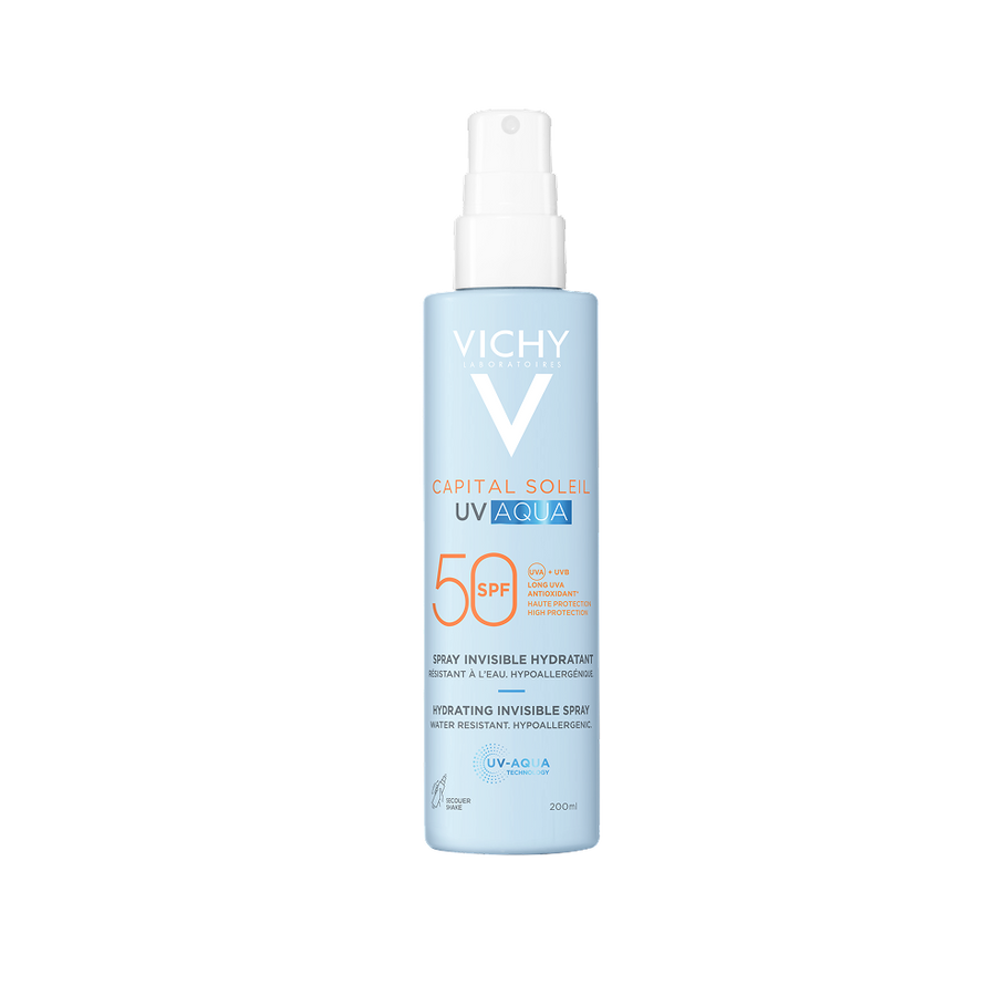 Reforçado com a nova e revolucionária tecnologia UV Aqua, o novo Vichy UV Aqua Spray Hidratante Invisível SPF50 é um fluido para rosto e corpo que protege a pele dos raios UVA, UVB e UVA longos. A fórmula é enriquecida com beta-caroteno, que ajuda a obter um bronzeado saudável e radiante, ao mesmo tempo que proporciona uma elevada proteção contra o sol.